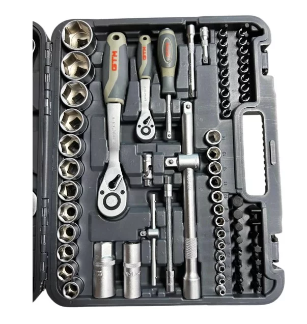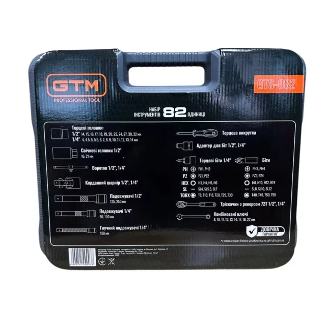 Комплект GTM GTS-082 включає 82 предмети, що охоплюють найбільш поширені завдання завдяки наявності двох посадкових квадратів: 1/4 дюйма та 1/2 дюйма. Усі компоненти виготовлені з високоякісної хром-ванадієвої сталі (CrV), що гарантує стійкість до іржі, вологи та екстремальних навантажень.