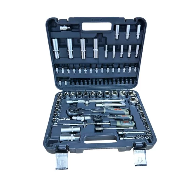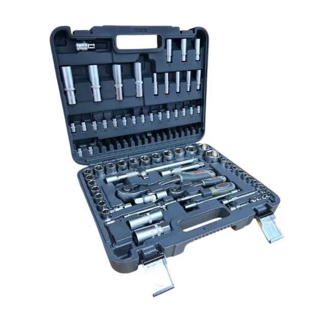 Максимальна комплектація: 94 предмети забезпечують повний функціонал, включаючи торцеві головки від 4 до 32 мм, тріскачки, подовжувачі, воротки та перехідники.