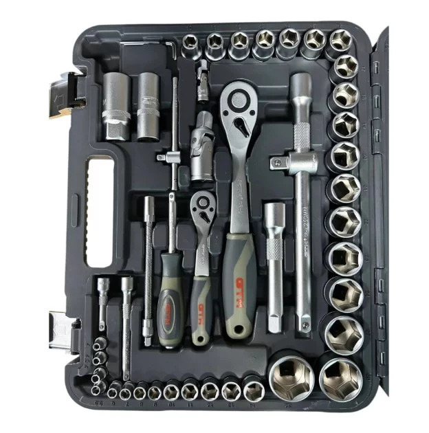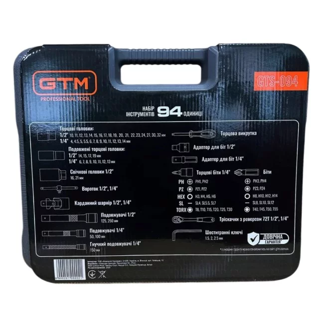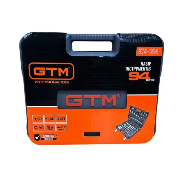 Набір GTM GTS-094 включає 94 елементи з двома найпопулярнішими посадковими квадратами: 1/4 дюйма та 1/2 дюйма. Усі інструменти виготовлені з високоякісної хром-ванадієвої сталі (CrV), що гарантує їхню довговічність, надійність та стійкість до корозії, вологи та високих навантажень.